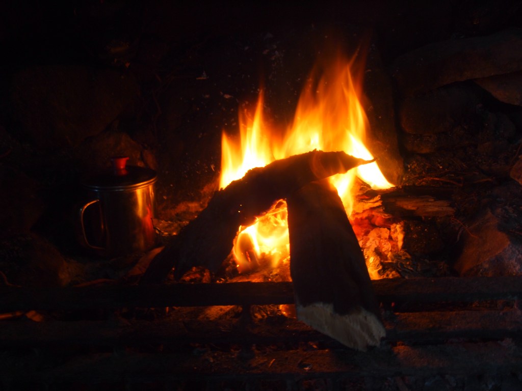 On the advice of the Belgians I headed towards Canisp in search of a broken old bridge with some possible rotting wood, but found it was mostly still nailed into the ground and thought best to not vandalise it…but there were a few splinters around. On my way back I met four middle-aged female hikers who all seemed slightly wary of my appearance. To be fair I did have plastic supermarket bags for socks (to avoid putting dry socks in wet shoes) whilst hauling back my mismatch collection of wood. I came back with some bracken, one small soggy log and one huge sodden master log, and with the aid of some fire starters and leftover kindling managed to get a small fire going. However the master log was just too sodden to get going properly and after about an hour of willing it on it flickered into nothingness, shoes still damp.