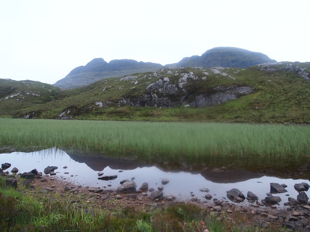 All night the pitter-patter of the rain on the roof mixed with the stiff sleeping boards threatened to keep me awake through the night. Even with a roll mat underneath I had to resort to solely sleeping on my back to get any sleep. Nonetheless, it was a relief waking up in inside, as opposed to what would’ve been a drenched midge-infested tent that morning. It was a dreary morning with Suilven and Canisp hidden beneath low clouds, making my plans for hiking up one of them rather obsolete with no visibility above around 100m, so I set about finding some firewood to help dry out my damp shoes. There was a slight problem with this task; Assynt is an area completely devoid of forests and trees with the typical flora being bogs and marshes. There wasn’t even any peat.