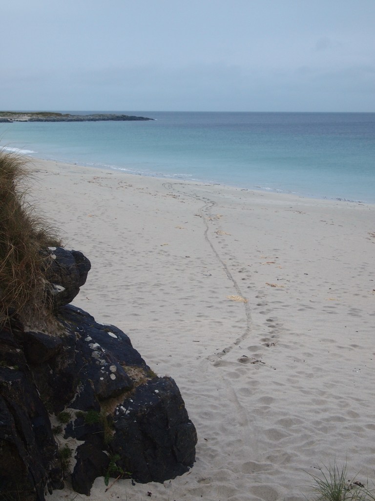 On the far side of the bay I spotted a grassy looking cove that looked like it would be sheltered from the wind, if not the rain, so undertook the challenge of pushing the laden bike across the sand. For the most part this was fine, as the tide was only just on its way out leaving a route of firm enough sand across the beach. But the final push up through soft sand to the grassy cove was excruciatingly uncomfortable with a fully laden bike, leaving me with sand everywhere. Oh well, it hadn’t taken me long to ensure I would have a lovely sand filled tent! Still, it was an idyllic and silent spot, and with a vast headland that I explored once the rain had passed, before settling in to sleep to the (not actually very) soothing sound of the waves.