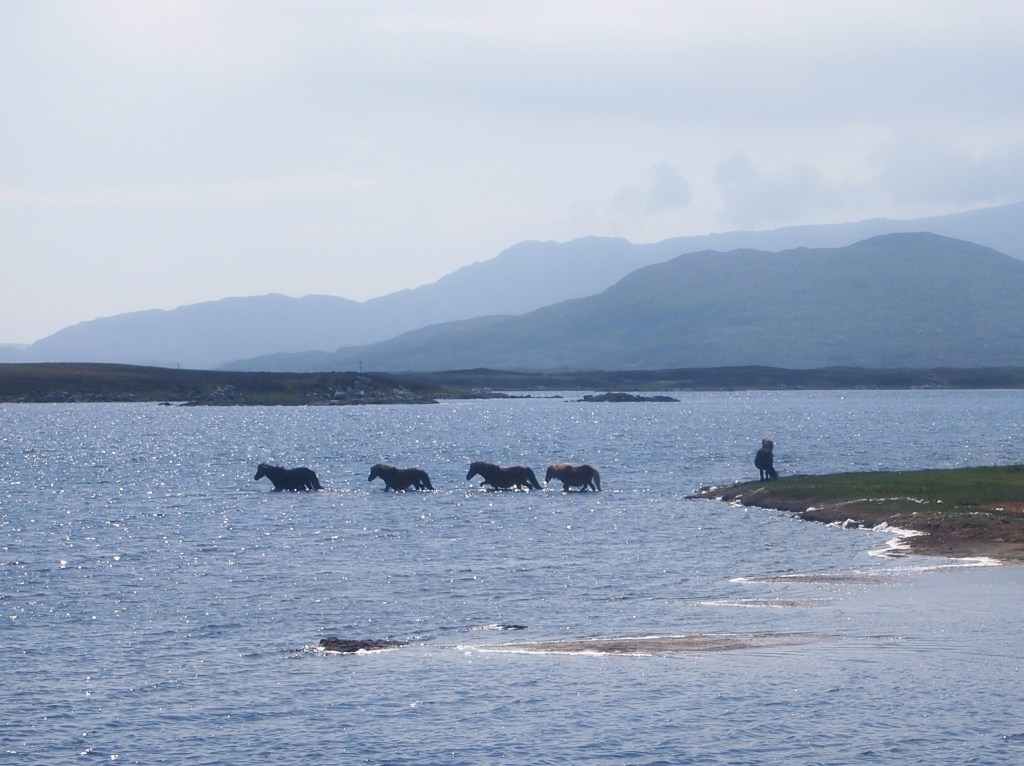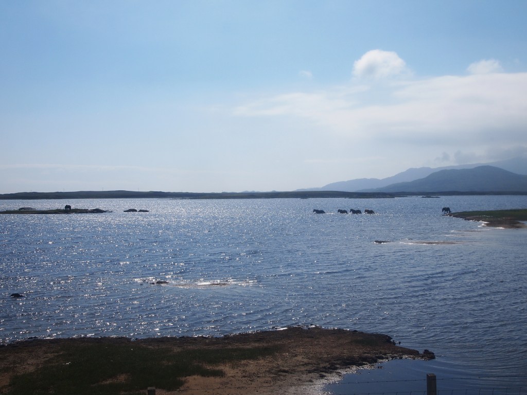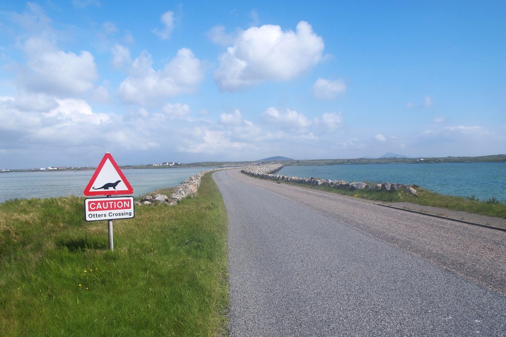 Heading north past the three hills of South Uist the landscape becomes remarkably flat, especially by Scottish standards, and after Loch Bi the hills disappear completely until North Uist. The flat landscape makes you more exposed to the wind, and unfortunately I was heading into a northerly that felt like a gale, especially by English standards. I had planned another easterly detour for lunch at Loch Carnan but signs for a wind farm at the Loch promised a less picturesque location than Loch Aineort the day before, so I continued towards the Causeway between South Uist and Benbecula. This stretch along the top of South Uist wasn’t without interest though, crossing Loch Bi I spotted a wild horse wading way forward through the Loch to a central island. Back on dry land, a number of others stood and watched, seemingly unconvinced by their rogue friend, but as it reached dry land the others all followed suit.