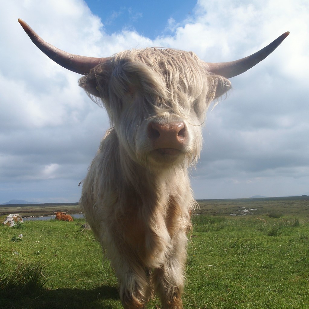 With the weather again my guide I avoided the cloudy coastlines and followed the old military road over the hill pass of central North Uist, meeting some very hairy Hebridean cows along the way…