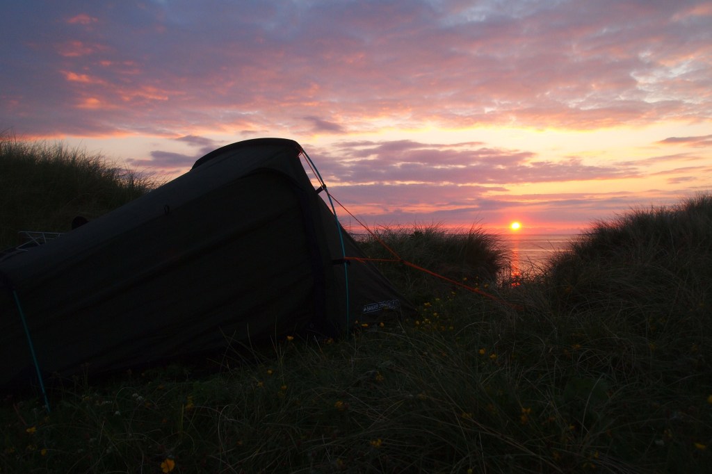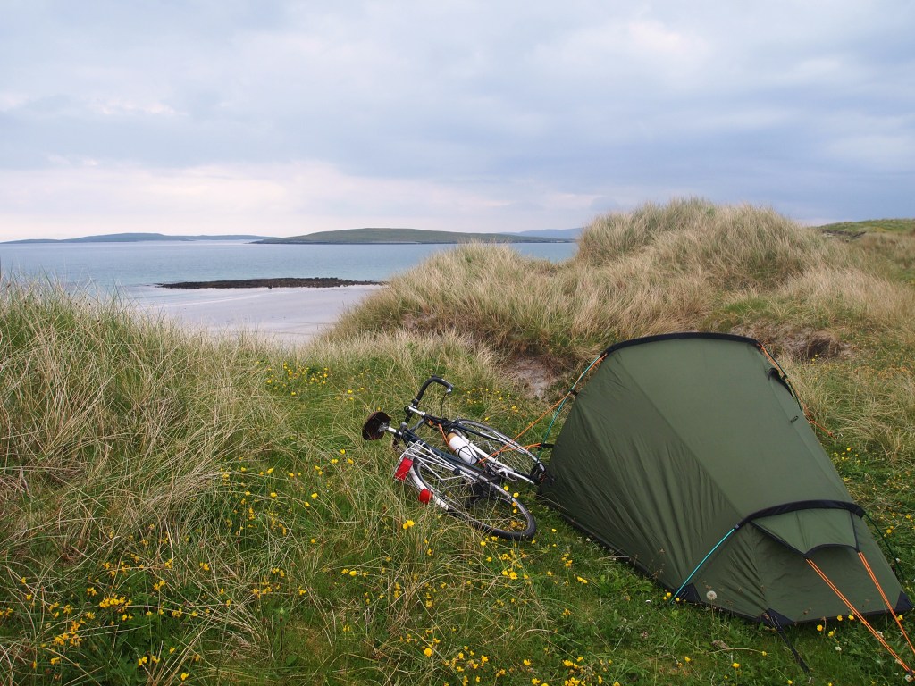 The similarities to the previous evening were uncanny. Again I was searching for a sunset camping spot along the west coast knowing there was a hostel nearby as a back-up option, but again I found a perfect spot by a beach near a headland cemetery. It wasn’t quite so straightforward this time though; I had been down two false trails at the top of North Uist and gashed my leg through stupidly losing my balance and smacking the mud guards, before eventually finding the ideal road with ‘beach access only’ down to Clachan Sands.