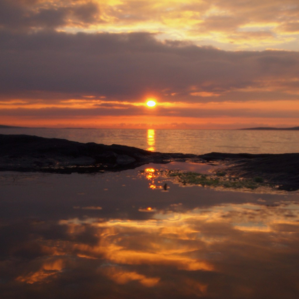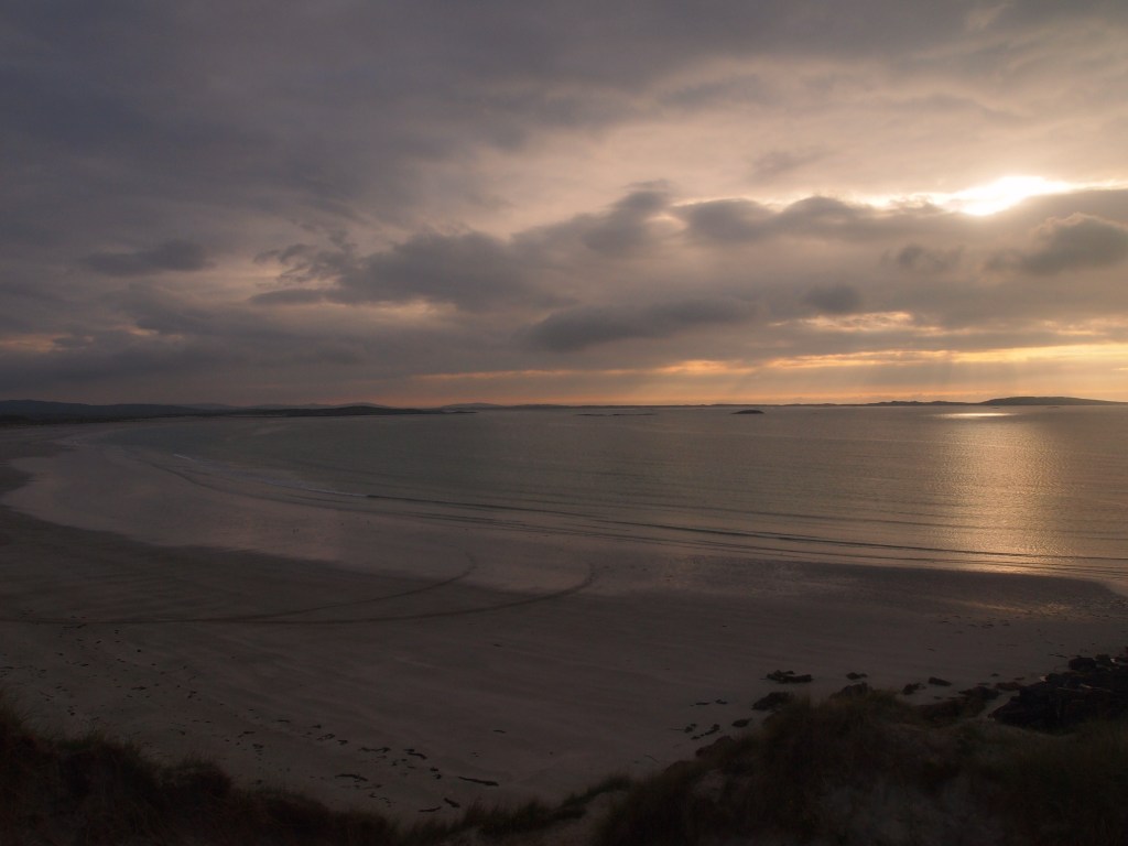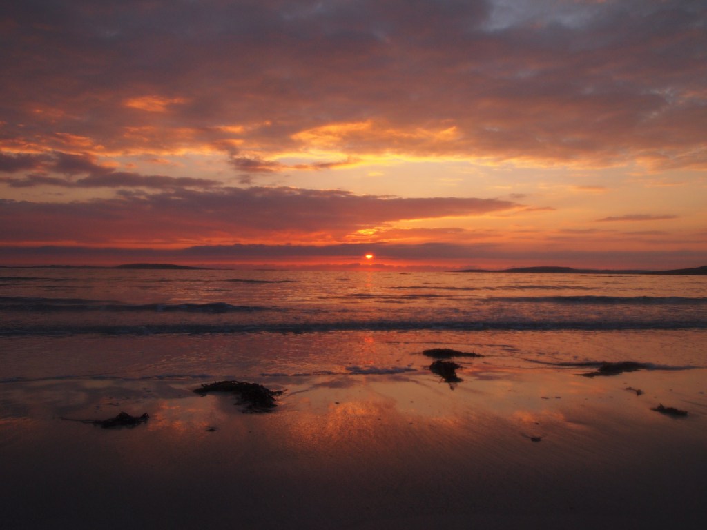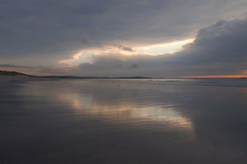 Like the first night on Barra, here was a bay that wouldn’t be out of place as a holiday destination in the Mediterranean, only this time I did have Mediterranean-lite weather too. A mile-long stretch of pristine white sand and clear turquoise water, all to myself. That was until a local on a quad bike appeared and started doing donuts along the open sand. I think he was as surprised to see me as I was to see him. With the tide going out leaving a glistening sheen on the sand the beach almost looked like salt flats, with the setting sunset reflected on the mirror-like sand.