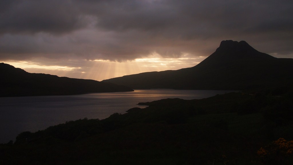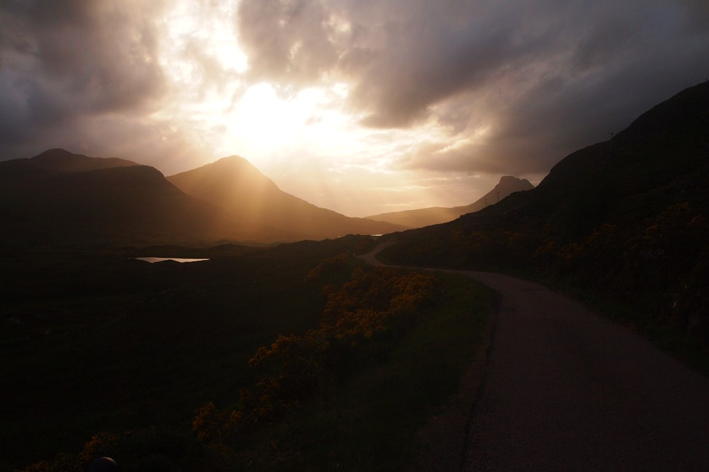 Turning left off the A835 towards the mountain of Stac Pollaidh revealed a dramatic sunset flittering between the clouds over Loch Lurgainn and a beautiful road sweeping towards it:
